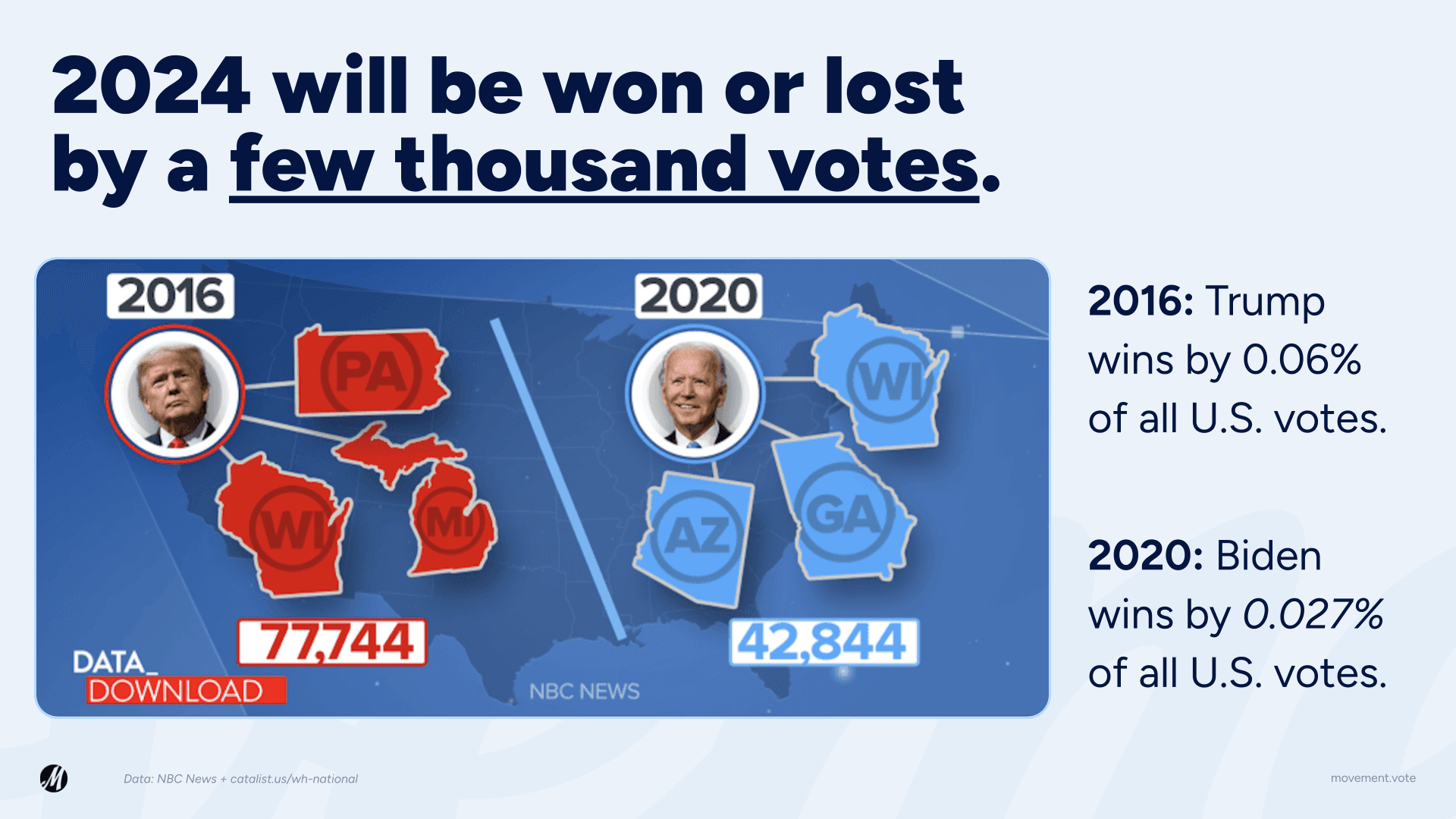 Local organizers and trusted messengers made the difference in 2017, 2018, 2020, 2022, and 2023. They can deliver again in 2024. But it’s going to require an unprecedented Apollo Project level of investment.