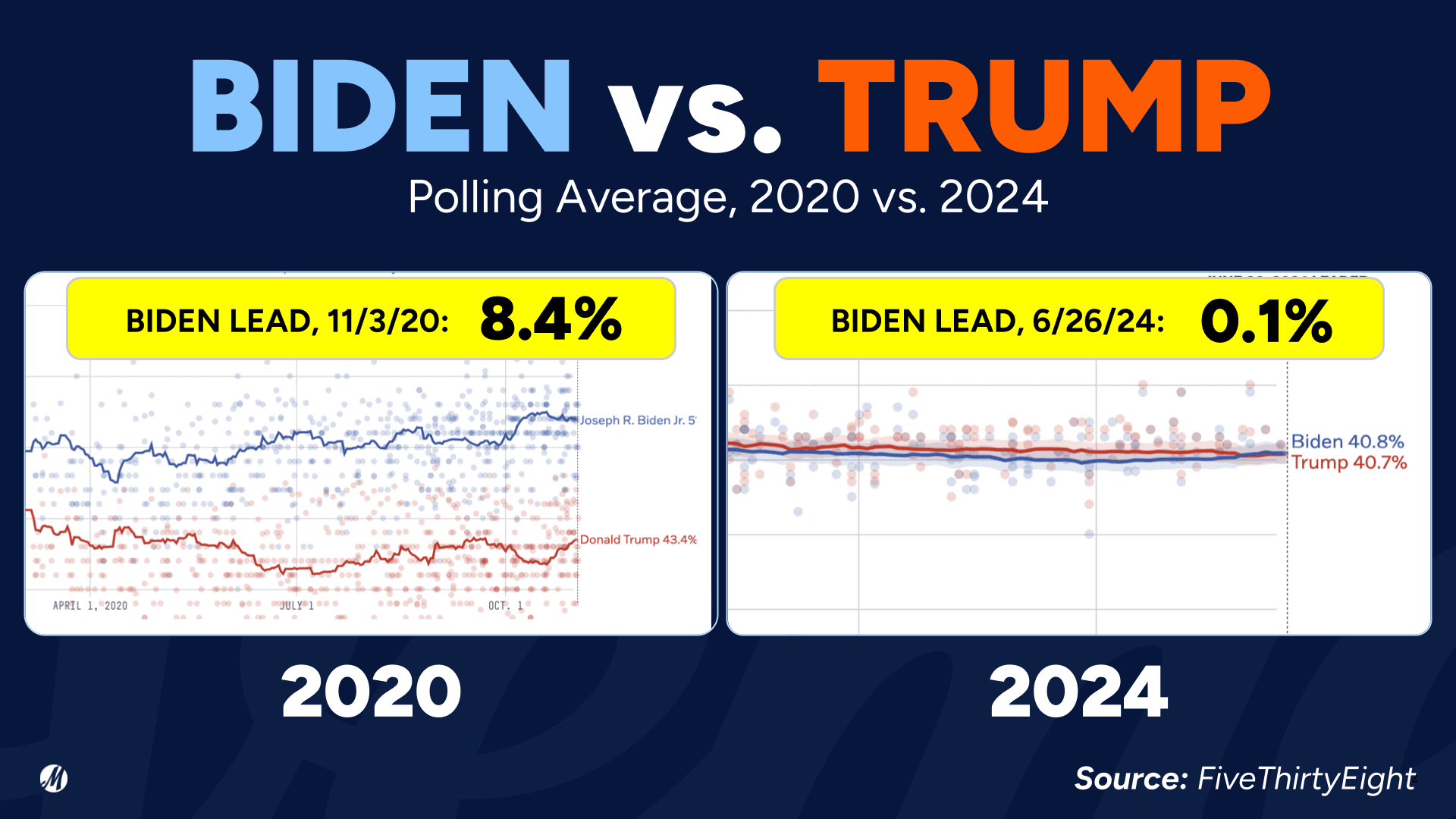 As of June 26th, Biden leads Trump in aggregated national polling by 0.1%. That might sound OK until you consider that on Election Day four years ago, Biden led Trump by 8.4% in an election in which he ultimately won the popular vote by 4.5% (more than 7 million votes). And that huge lead allowed him to squeak out a measly 43,000-vote margin across just three states in the Electoral College.
