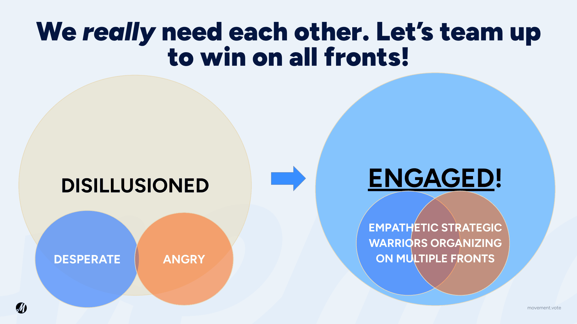 I get excited about organizing millions of donors to fund movements and solutions at all levels to scale up the magic. I want to see us out-competing the right-wing MAGA cult and haters with love and compassion. The left is too often operating from a place of scarcity, fear, reaction, and anger instead of positive vision, true inclusion, and respect for all people.