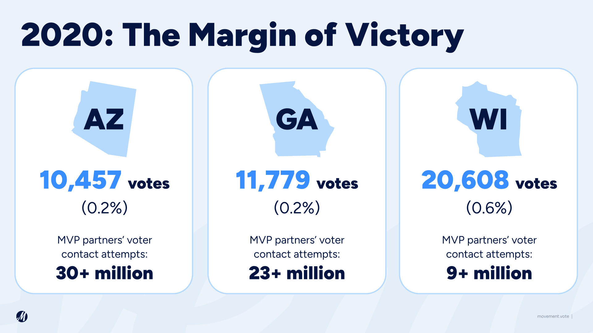 In 2022, MVP partners had an unparalleled win record in close races. In 2020, our partners turned out far more voters than the margin of victory in Arizona, Georgia, and Wisconsin — the three closest Biden-won states (see page 9 of our recent report).