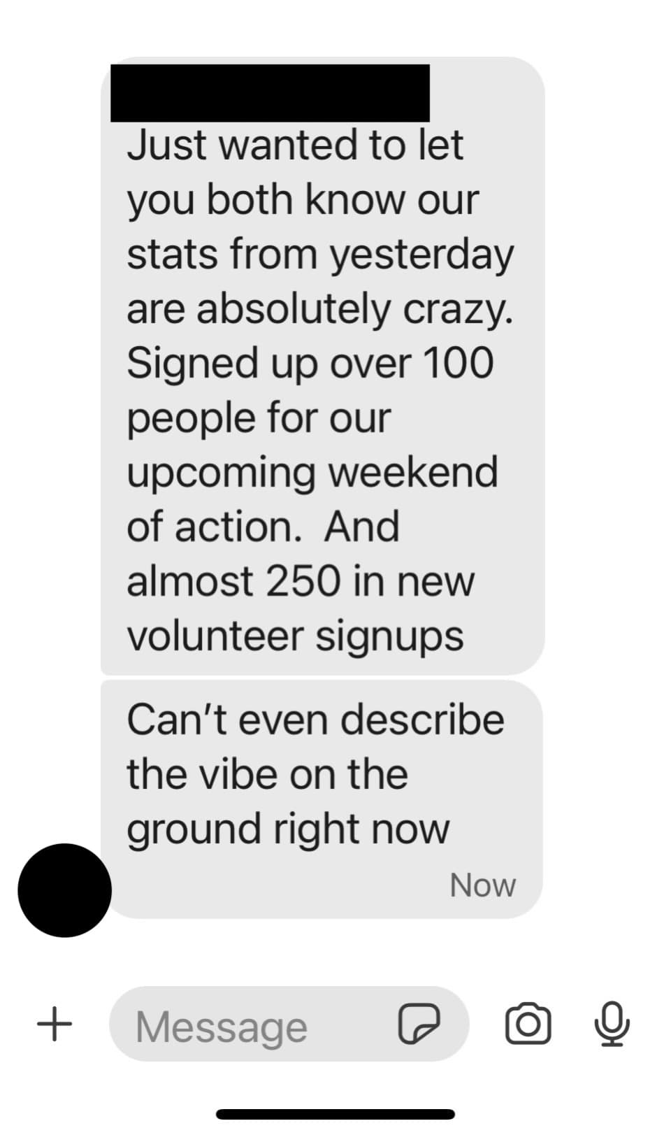 One of our staff just got this text from a Midwest organizer on the ground: