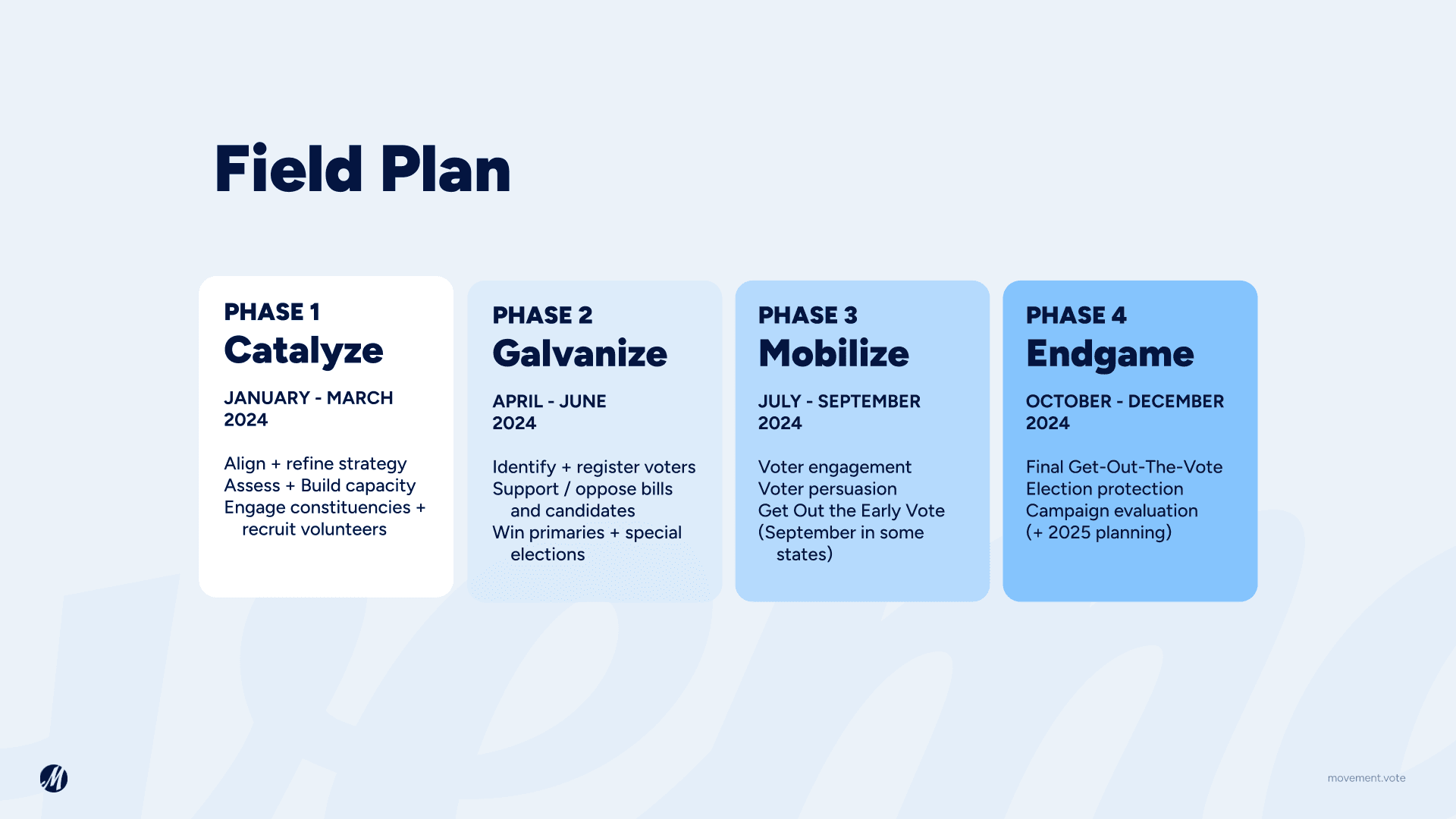 To situate us in where we are and where we’re heading: We are currently in Phase 2 of MVP’s 2024 Field Plan, a roadmap that systematically builds engagement, resources, and power to carry us to victory on Election Day — and, crucially, to keep momentum going into 2025, no matter the outcome on November 5th.